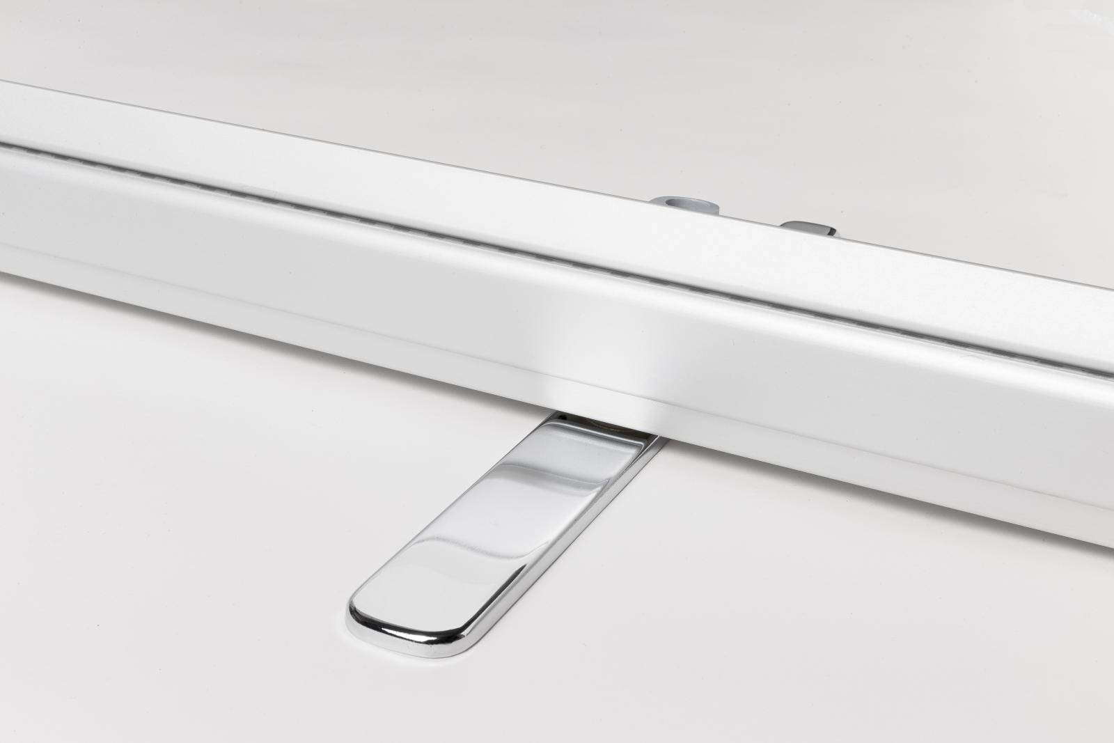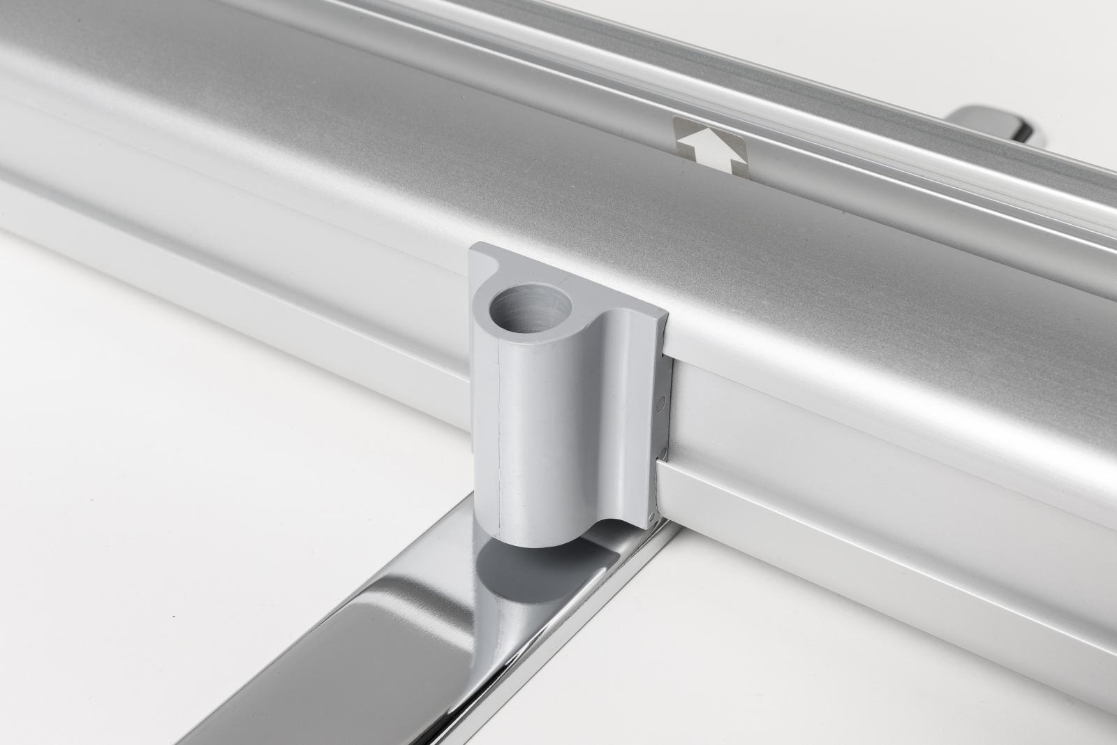 - Aluminiumkassette mit einem ausklappbaren verchromten Fuß und verchromten Seitenteilen.